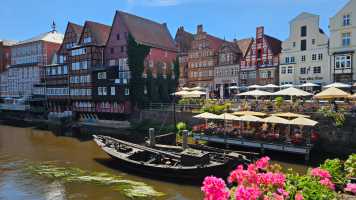 4.Tag: Das Wetter spielt erneut mit und wir freuen uns auf eine Tour nach Lüneburg entlang der Ilmenau und landen direkt in der Altstadt Lüneburgs. Wir stärken uns - mit Blick auf den „Alten Kran“ - mit einem guten Mittagsmenü. Alle Teilnehmer nutzen ein wenig ‚Freizeit’ für einen Stadtbummel, einer Besichtigung der schönen Altstadt mit Rathaus, Kirche und netten Einkaufsmöglichkeiten. Zurück geht es über die Brause-Brücke entlang des Elbe-Seiten-Kanals, machen Halt an dem imposanten Schiffshebewerk in Scharnebeck und landen - über das mittlerweile vertraute Kopfsteinpflaster - vor unserer Herberge.