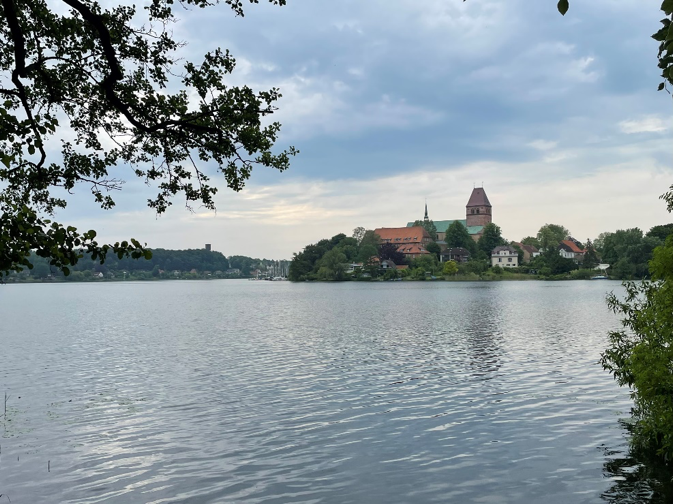 Nachdem 19 Personen ihre Zimmer bezogen haben, kommt unsere tägliche Gastwanderin, die nahe Ratzeburg wohnt, dazu. Wir starten am Samstagnachmittag am Ratzeburger Dom. Die erste Tour von 13 km führt uns über Farchau und Farchauer Mühle rund um den Küchensee. Das Gewitter lassen wir glücklicherweise hinter uns, Regen gibt es wenig, dafür machen wir erste Bekanntschaft mit den Mücken, unsere ständigen Begleiter. Abends gibt es im Gästehaus des Domklosters -unser Quartier für 4 Nächte in alten Gemäuern- ein leckeres Abendessen. Danach singen wir zur Gitarre und hören Kurzgeschichten und Gedichte, unser tägliches Abendprogramm.
